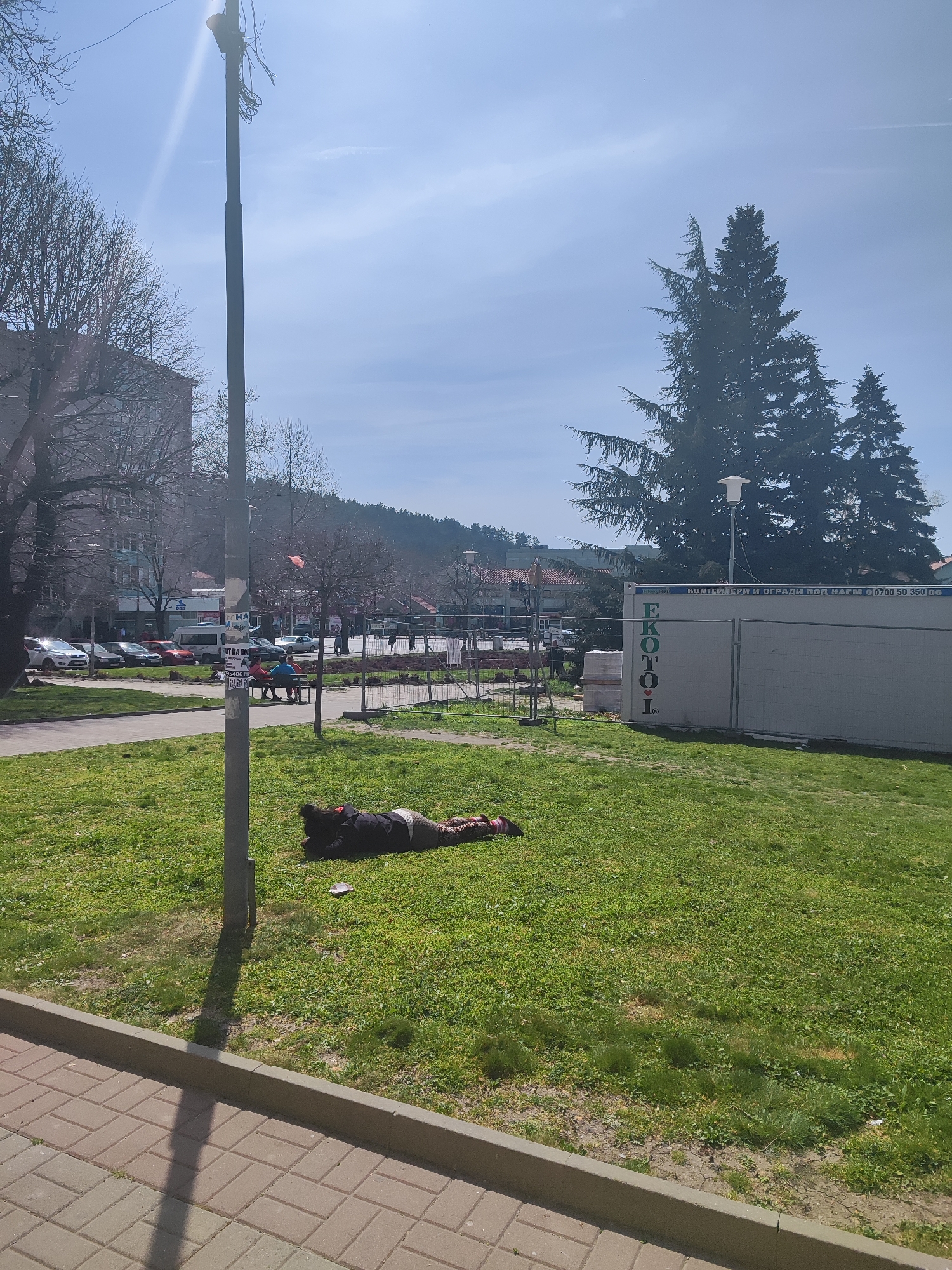 The scene depicts an outdoor urban environment in Sliven, Bulgaria, under a clear, light blue sky. In the foreground, a person is lying prone on a patch of green grass to the right of a dark metal utility pole. This individual is dressed in dark clothing, including what appears to be a black jacket and patterned leggings, with their head oriented towards the left. A small white object rests on the grass near their head. The grass itself is predominantly green but shows areas of wear and bare earth. A paved sidewalk, constructed from light-colored interlocking pavers, runs along the bottom edge of the image, bordering the grassy area. The metal pole, positioned slightly left of center, casts a long, distinct shadow across the grass and sidewalk, indicative of strong sunlight from a high angle. In the midground, beyond the grassy area and pole, a paved road is visible with several parked vehicles (including white, red, and grey cars) and some active traffic. Various pedestrians are present on the sidewalks and near the road, and two individuals are seated on a bench to the left of a large, white modular container. This container features the vertical inscription "EKOTOL" on its left side and horizontal Bulgarian text reading "КОНТЕЙНЕРИ И ОГРАДИ ПОД НАЕМ" (Containers and fences for rent) along with a phone number "0700 50 350". A metal fence partially separates the container and street from the grassy area. The background includes several bare-branched deciduous trees and tall, dark green evergreen trees. Multi-story buildings are discernible behind the street and trees on the left. A wooded hill or mountain range defines the horizon under the clear sky.