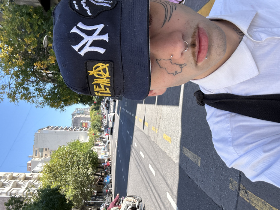 The image depicts an urban street scene on a busy avenue in Buenos Aires, Argentina, under a clear blue sky. The perspective places the viewer close to a person, whose upper body occupies the right foreground of the frame. This individual wears a white collared shirt and a navy blue baseball cap adorned with a white New York Yankees "NY" logo, a yellow "FIENΔ" patch with an anarchy symbol, and another dark patch with a white design. The person exhibits a light mustache, a silver septum ring, a vertical labret piercing with a silver barbell, and a small silver stud on the right cheek. Tattoos include an outline resembling a geographical map on the right cheek and stylized lines near the right temple. A black strap, likely from a bag, is visible over the subject's right shoulder. The background reveals a wide asphalt road with white dashed and solid yellow lane markings, indicating multiple lanes. Cars are parked along the left curb, while other vehicles, including a motorcycle with a rider, are in motion further down the avenue. Multi-story buildings with balconies and lush green trees line both sides of the street, casting distinct shadows under the bright daylight. The overall environment is consistent with a major urban thoroughfare in Buenos Aires.