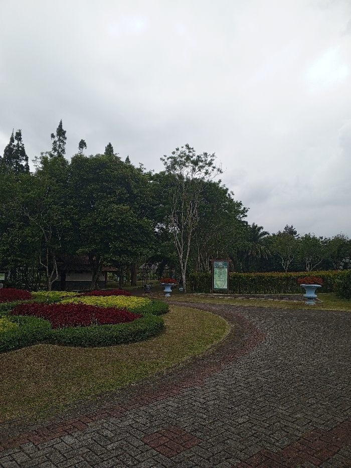 A serene park scene unfolds under an overcast sky. A vibrant flowerbed showcases red, yellow, and green hues. Behind, lush trees provide shade, framing a traditional structure. A paved path curves gently, leading towards an information sign flanked by two blue planters. The scene is peaceful and well-maintained.