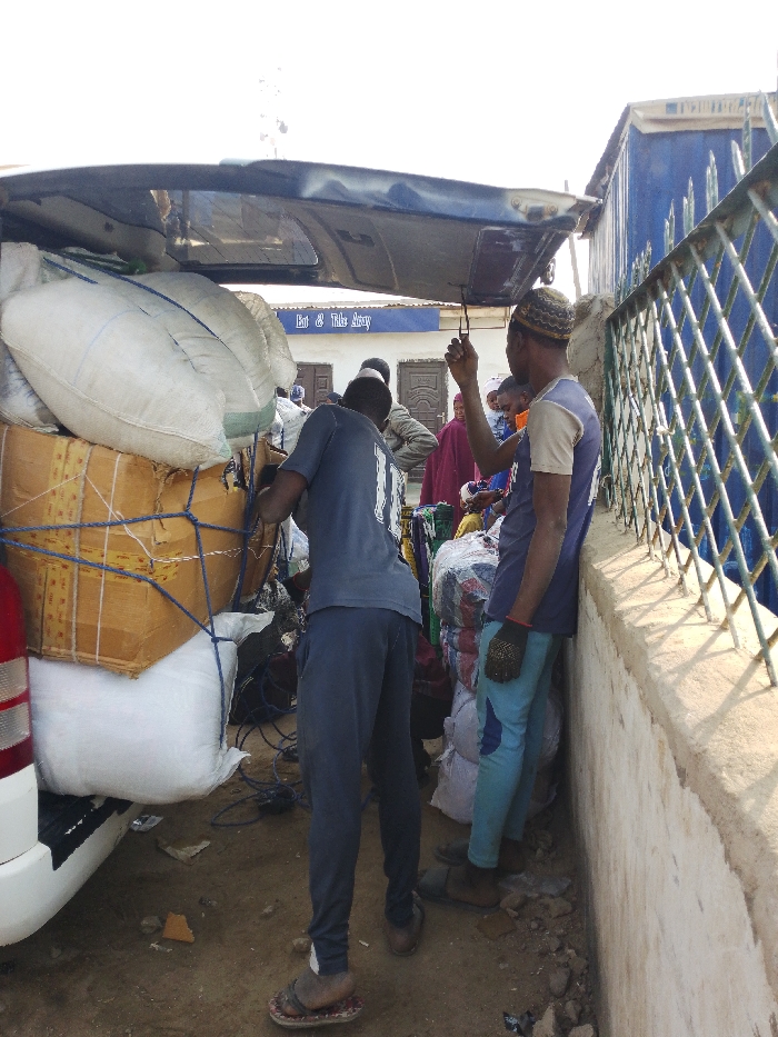 The image presents an outdoor scene in Unguwa Uku Kauyen Alu, Nigeria, focused on a white van with its rear hatch open and heavily loaded
