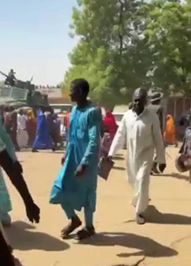 group of people walking on a dirt road on a sunny day. The individuals are diverse in age and wear a variety of clothing. Several are dressed in traditional attire, including long white robes. A child in patterned clothing carries a flat, round object. The group appears to be moving with purpose. Trees and buildings are visible in the background.