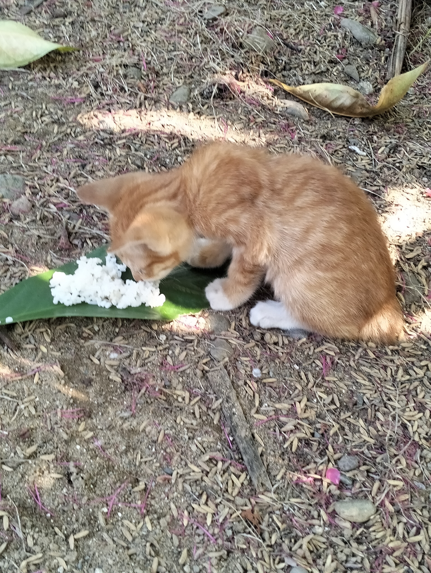 - "In Meunasahalue, Indonesia, a small orange and white tabby kitten is observed eating cooked white rice from a broad green leaf positioned directly on the ground" by FM-sAcf03, licensed under CC BY 4.0