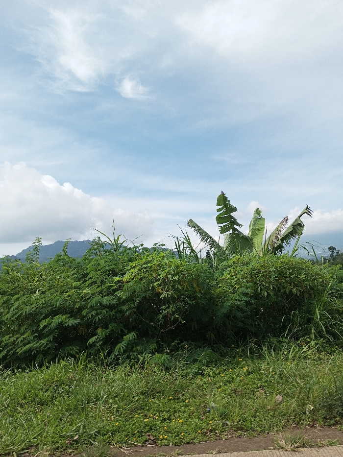 The image displays a verdant outdoor landscape in Matale, Sri Lanka. The upper two-thirds of the frame feature a light blue sky with scattered white cumulus and cirrus clouds. The foreground consists of a narrow strip of grey concrete or asphalt along the bottom edge, bordering an area of green grass, various weeds, and sparse small yellow flowers. Immediately behind this, a dense thicket of diverse green foliage dominates the midground, comprising numerous shrubs with small, compound leaves, tall grasses, and several large, green, partially tattered leaves consistent with banana plants, prominently visible on the right side. In the distant left background, green mountains are discernible, partially obscured by cloud cover. No individuals, animals, specific human-made objects, actions, or interactions are present within the scene.