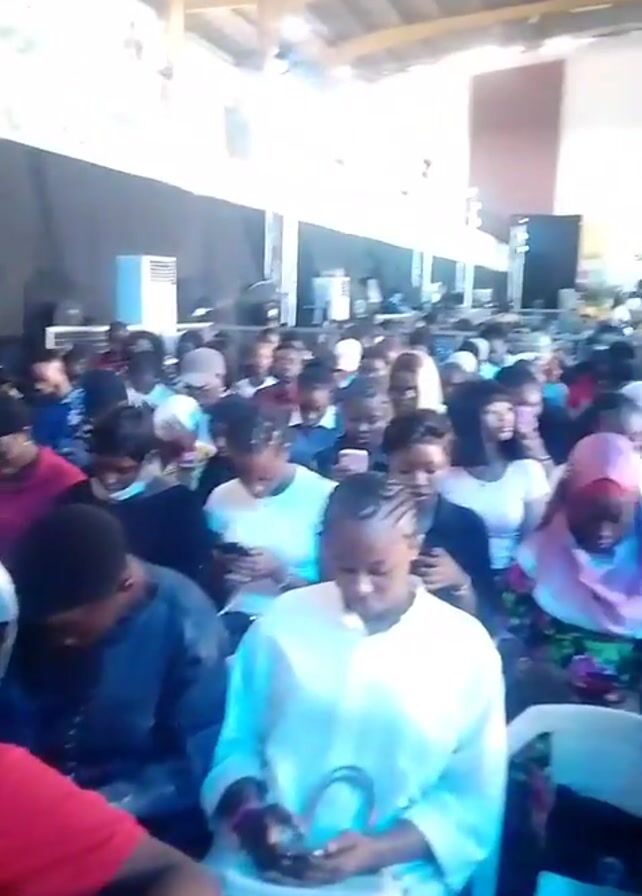 The video depicts a large group of people seated in a large indoor space, possibly an auditorium or event hall