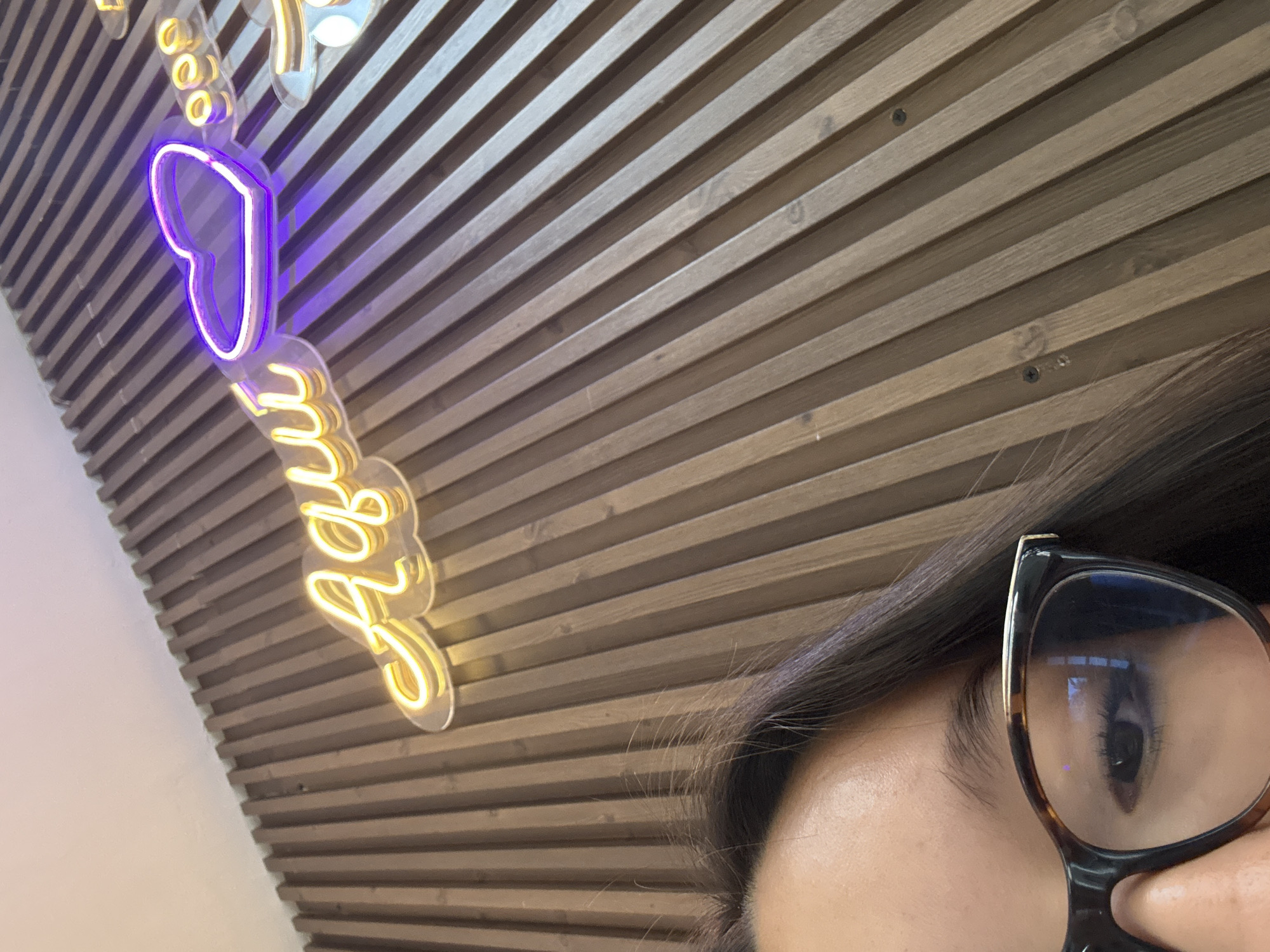 A close-up shot features a person wearing glasses, with a neon sign in the background. The sign, comprised of a neon heart and cursive lettering, is affixed to a wall with a horizontally-lined wood texture. The person's face is partially visible, focusing on the eye behind the glasses. The environment appears to be indoors. Acapulco, Mexico is not obviously evident in the image.