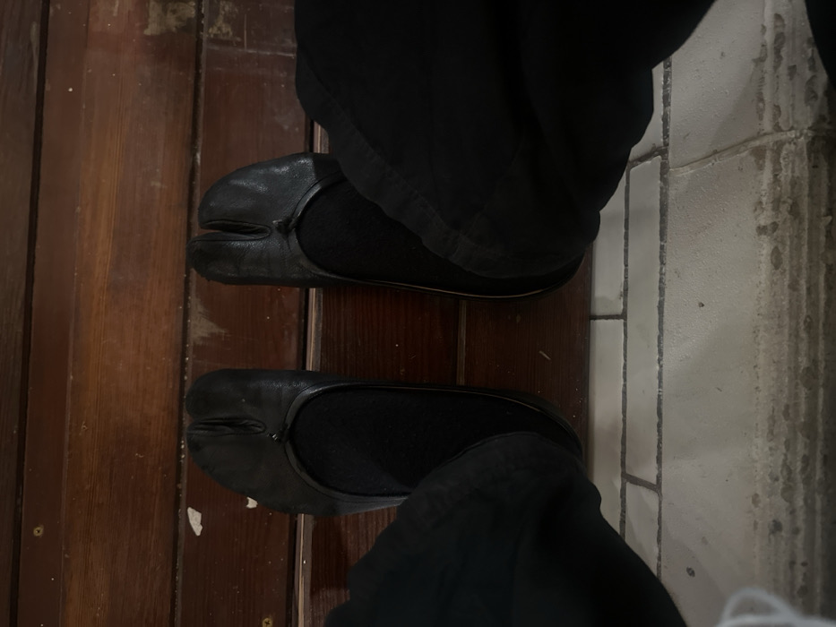 The image presents a downward, first-person perspective of an individual's lower legs and feet. The subject is wearing black tabi-style ballet flats or loafers, crafted from leather, exhibiting minor creasing and wear. Black socks are visible between the shoes and the black trousers, which cover the lower legs. The feet are positioned at the junction of two distinct flooring materials. The upper two-thirds of the frame show a dark reddish-brown wooden floor, consisting of multiple horizontal planks with visible dust, small white debris, and embedded screw heads. The lower third displays a lighter, possibly off-white, rectangular tiled floor with dark grout lines, arranged in a staggered pattern. The exact location within Manchester, United Kingdom, cannot be determined from the visual information provided.