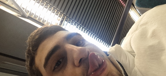 An eye-level selfie features a person sticking out their tongue. The subject has dark hair and fair skin. The background consists of metal bars. The person wears a white jacket. The lighting is bright. The image is slightly tilted. The focus is on the person's face.