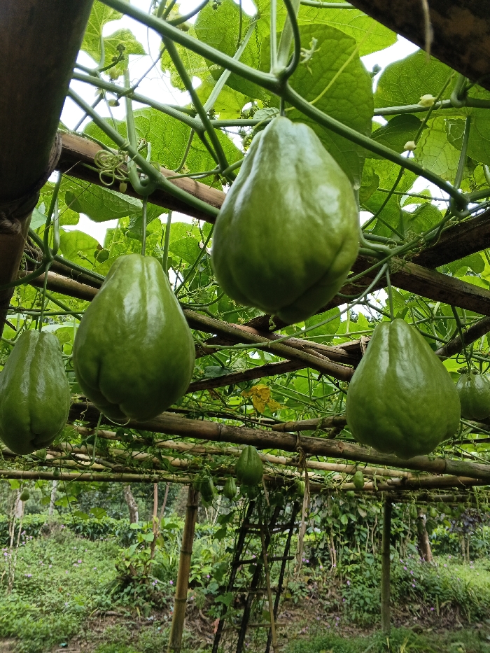 - "This image captures an overhead bamboo trellis densely covered with chayote (Sechium edule) vines and numerous hanging fruits in the city of Unknown, Vietnam" by FM-ukh5x2, licensed under CC BY 4.0
