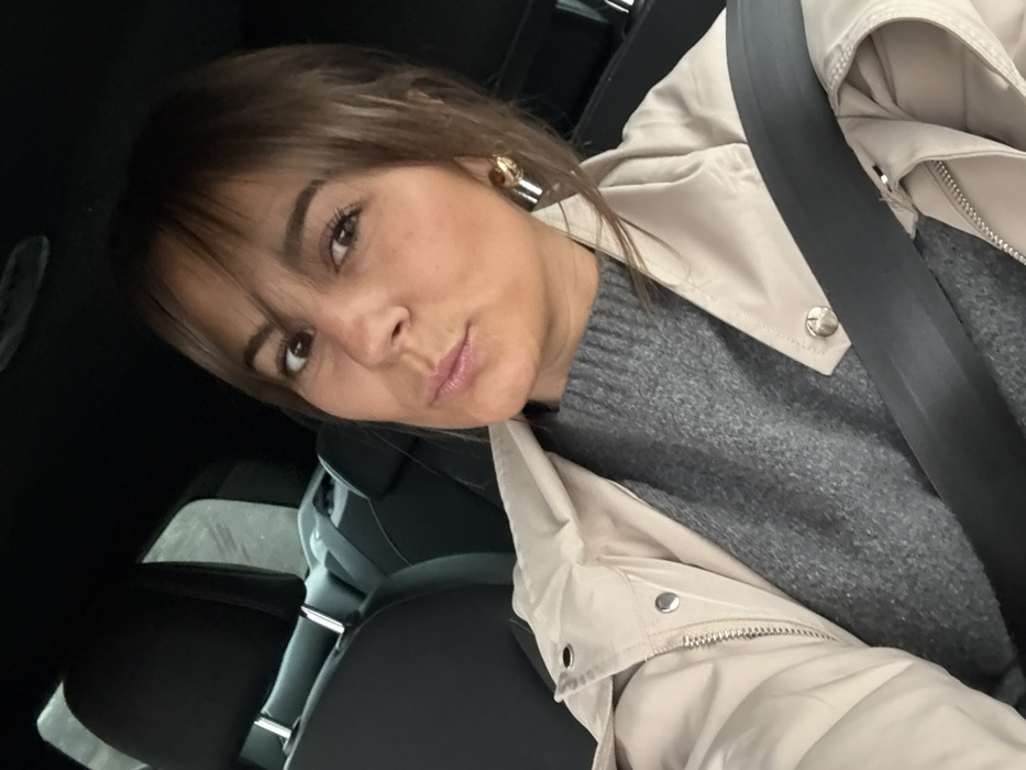 A female individual is depicted from the chest up, seated within the passenger compartment of a vehicle. She has medium brown hair with bangs, brown eyes, and is looking directly towards the camera with her lips slightly pursed. She is wearing a grey knitted sweater under a light beige or cream-colored padded jacket, secured by a dark-colored seatbelt crossing her chest. A gold-toned earring is visible on her right ear. The interior background shows dark-colored vehicle seats and headrests, suggesting the rear passenger area. This scene is located in Veauche, France.