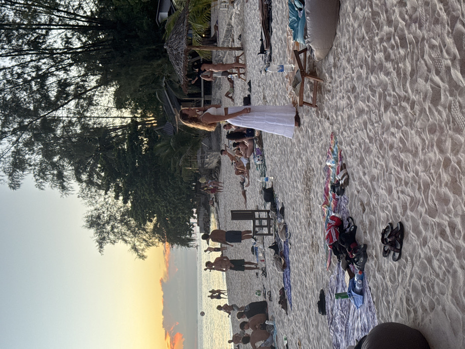 This image depicts a busy beach scene at sunset in Baan Sri Thanu, Thailand