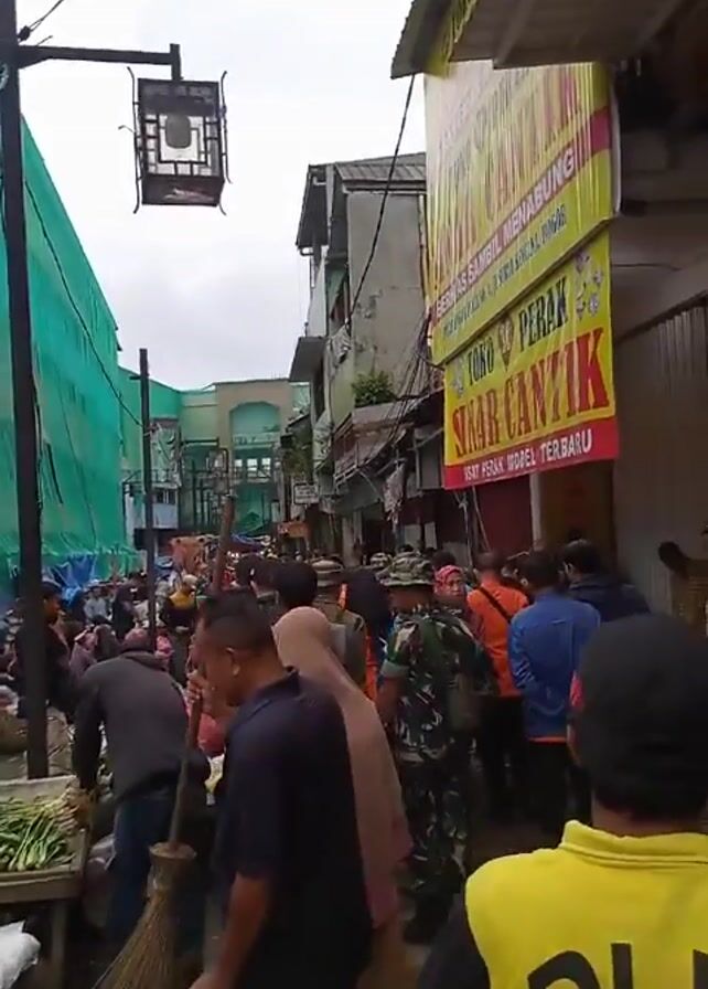 The camera is positioned from the back of a crowd of people as they walk along a narrow street in what appears to be an outdoor market. To the left, a tall building is covered in green tarp, while vendors' stalls line the way, selling goods. The camera pans slightly to the right, revealing a building with a yellow sign advertising "Toko Perak Sinar Cantik" (Silver Shop Sinar Cantik) and "Isat Perak Model Terbaru" (Latest Silver Models). The crowd moves slowly, with various individuals identifiable by their clothing, including civilians, people wearing uniforms (possibly military or rescue personnel), and individuals in matching jackets with the words "PENGGERAK KERUKUNAN" (Movement of Harmony) on the back. The weather appears overcast, with a gray sky above. The scene suggests a bustling market area possibly undergoing renovation, with the presence of uniformed personnel indicating a potential organized event or response to an incident.