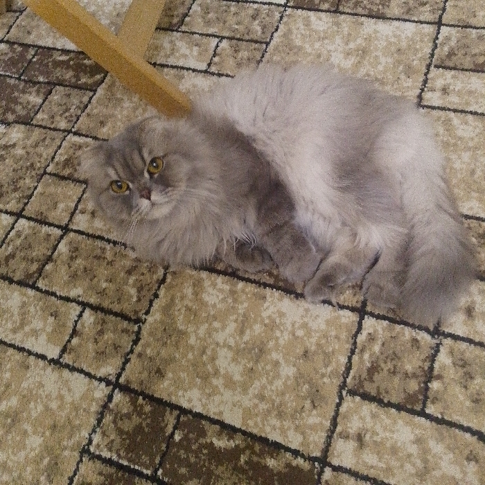 - "A fluffy, grey cat lies on a carpet with a brick-like pattern" by FM-o4pOG2, licensed under CC BY 4.0