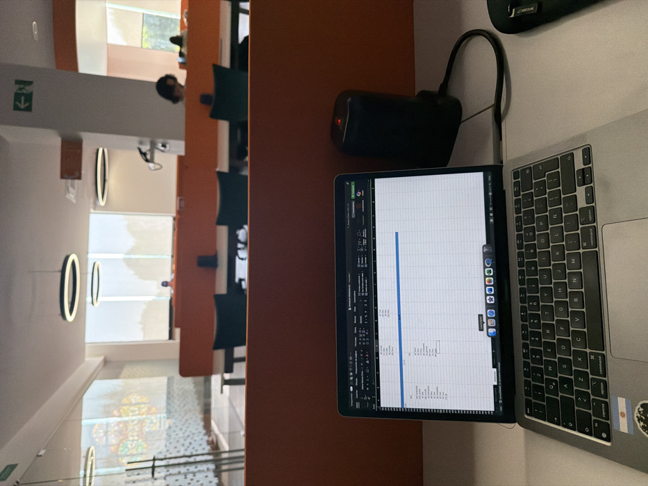 A rotated indoor scene shows a laptop open to an Excel spreadsheet, placed next to a small black electronic device with a power cord. The computer's keyboard is visible and has an Argentinian flag sticker on its edge. The desk is long and reddish-orange. The background shows a modern office space with round, lighted decorations, and windows, with chairs placed along the same table. There is a person visible in the background.