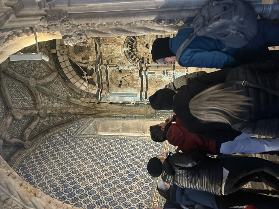The image depicts an interior view of the Chapel of Our Lady of Pity within the Pena Palace (Palácio Nacional da Pena), located in the civil parish union of Santa Maria e São Miguel, São Martinho e São Pedro de Penaferrim, Sintra, Portugal. The scene shows approximately seven to nine individuals, mostly observed from behind, standing and facing a highly ornate carved stone altarpiece or tomb structure in the right background. The individuals are dressed in winter clothing, including dark puffer jackets, beanies, and sweaters. One person in the mid-ground on the left holds a black mobile phone, appearing to capture an image. The left wall of the architectural space is extensively covered with blue and white patterned azulejos (ceramic tiles), arranged in a diagonal grid. The ceiling features intricate ribbed vaulting in a Manueline architectural style, characterized by detailed carved stone elements and patterned segments. The prominent structure on the right is an elaborate, light-colored carved stone altarpiece or tomb, rich with figural sculptures, architectural motifs, and visible Latin inscriptions above it. Modern technological installations are present: a white rectangular device, consistent with a Wi-Fi access point or environmental sensor, is mounted on a bracket extending from a column near the ceiling on the upper right. A small, dark security camera or similar monitoring device is affixed to the azulejo-covered wall to the left of the main ornate structure. The lighting appears to be a mix of ambient and focused illumination on the carved stone elements.