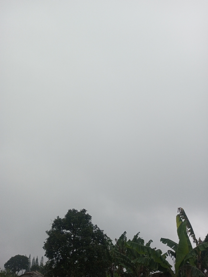 The image portrays an outdoor scene in Ingavali, India, under an overcast sky. The upper two-thirds of the frame are occupied by a uniform, light grey sky. The lower third features dense vegetation. A large, dark green, broadleaf tree stands prominently on the left. To its right, several banana plants with large, green leaves are visible, some exhibiting minor tears or fraying along their edges. In the extreme lower-left corner, a small, indistinct segment of a light-colored structure, consistent with a rooftop, is partially discernible beneath the large tree. Further in the background on the left, several conifer-like tree tops are partially obscured. No individuals are present, and no actions or interactions are depicted. The environment appears rural or semi-rural, illuminated by diffuse light due to the heavy cloud cover.