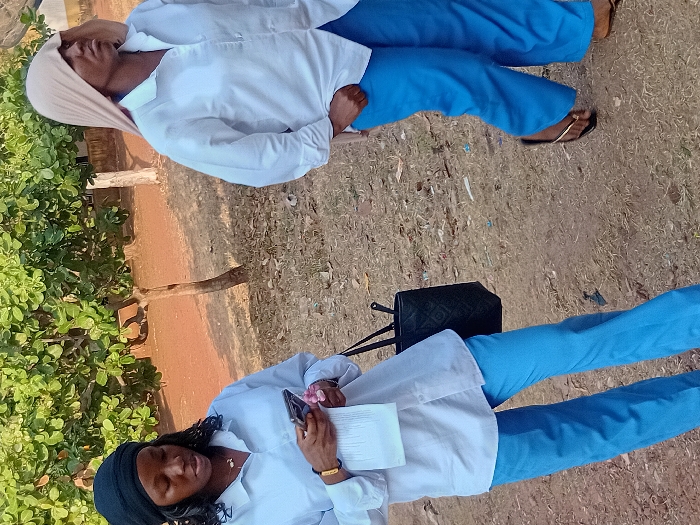 Two women, dressed in white shirts and blue pants, are outdoors. One is wearing a black head covering, holds a phone and papers. The other wears a beige head covering and sandals. A black bag is nearby. They appear to be on a dirt or grassy surface.