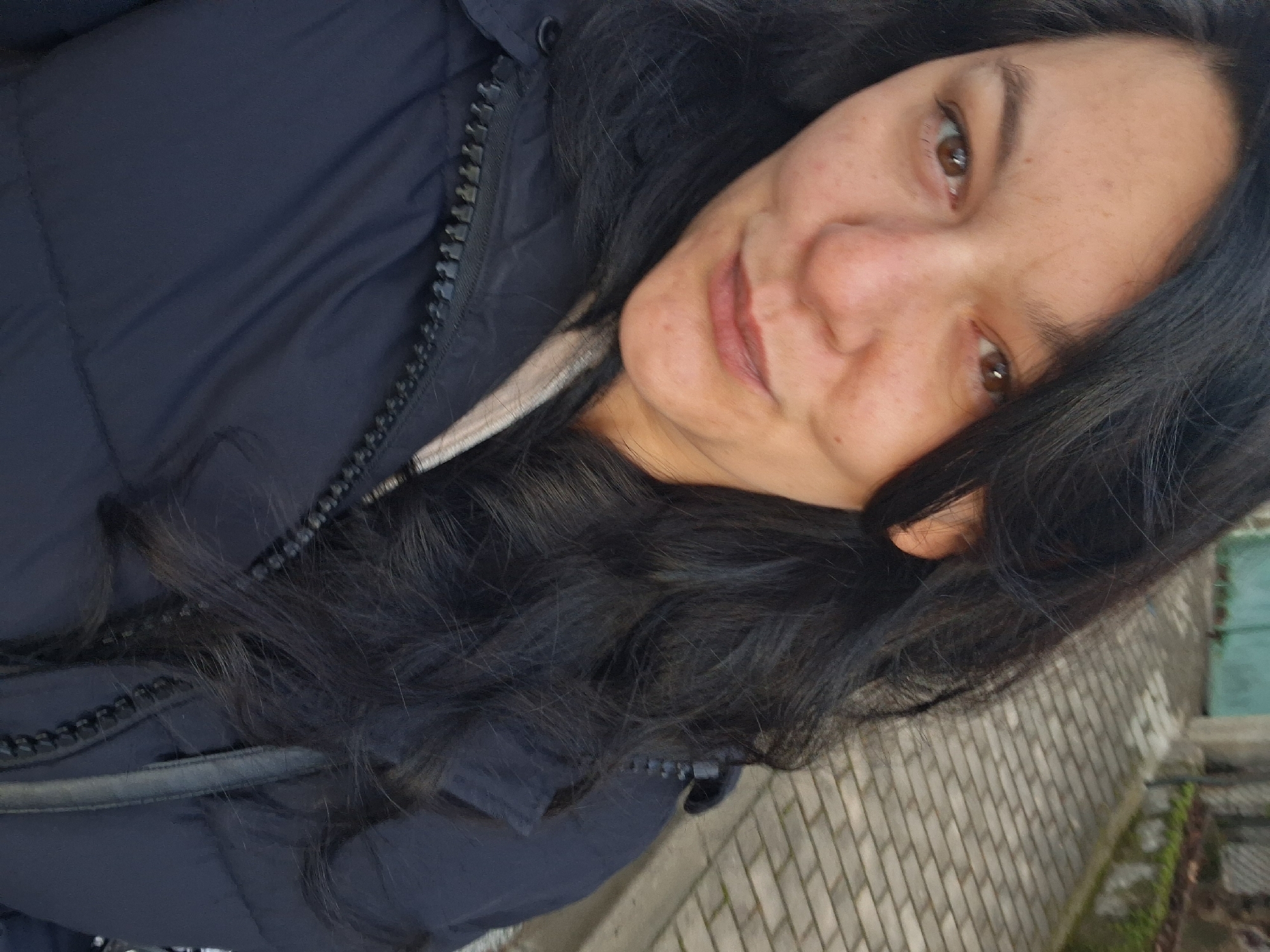 An outdoor, eye-level photograph captures a woman in a close-up, head-and-shoulders view. The woman, identified as a subject, possesses long, dark, wavy hair, brown eyes, and a light complexion with visible skin texture. She is wearing a dark blue padded winter jacket featuring a prominent black zipper. A lighter-colored inner garment is visible beneath the jacket's opening. A dark strap, consistent with a bag, is visible over her right shoulder. The subject maintains direct eye contact with the camera, her lips closed in a subtle upward curve. The background is largely out of focus but reveals a grey brick or cobblestone pavement. Beyond the pavement, a low wall or fence with traces of green vegetation is discernible, and a light blue-green gate or door is visible further in the distance. The scene is located on a street or pathway in Goce Delcev, Bulgaria.