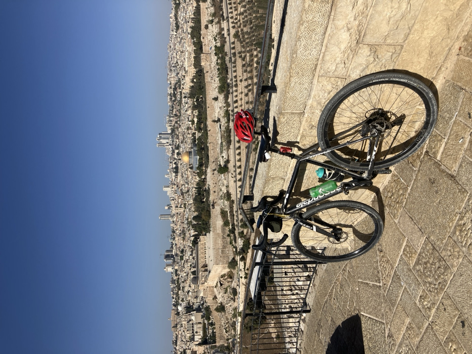 A black Cervelo Áspero gravel bicycle is positioned in the foreground, leaning against a light-colored stone wall. The bicycle is equipped with a green water bottle in a cage on the downtube and a small black saddlebag beneath the seat. A red bicycle helmet rests on a black metal railing directly behind the bicycle's seat. The ground is paved with light-colored, irregularly shaped stone tiles. The scene provides an elevated panoramic view of the Old City of Jerusalem, Israel, from what appears to be the Mount of Olives. In the midground, the golden Dome of the Rock is centrally visible on the Temple Mount/Haram al-Sharif, flanked by Al-Aqsa Mosque to its left. These structures are contained within the ancient stone walls of the Old City. To the right of the Old City walls, the Kidron Valley is visible, featuring a terraced cemetery with olive trees. The background extends to a denser urban landscape, transitioning into a distant skyline of modern high-rise buildings. The sky above is clear and blue, indicating bright daylight conditions. No individuals are present in the immediate foreground.