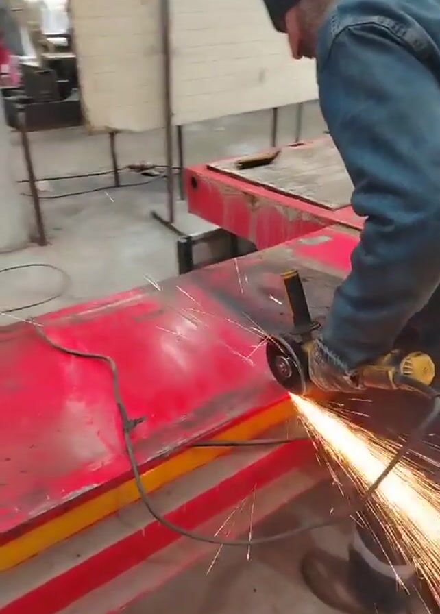 A person wearing a black beanie and a blue denim jacket is grinding a large, red metal surface with a yellow power tool. Sparks fly outwards from the point of contact, illuminating the surrounding area. The metal surface is positioned on a platform supported by red and yellow beams. The setting appears to be a workshop or industrial space with concrete flooring, and various pieces of equipment are visible in the background. There is also a white metal structure with wooden boards. A power cord is snaked around on the surface.