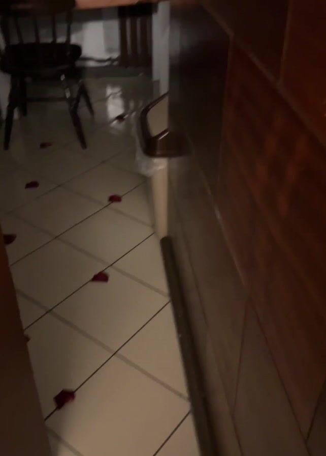 small, dimly lit dining area. The camera follows a trail of scattered, red rose petals on a beige-tiled floor. The petals lead to a wooden dining table covered with a wood-patterned tablecloth. The table is set for a meal with four bowls or plates, each containing different food items such as a salad with tomatoes, meat, and vegetables. A fork lies next to one of the bowls. The dining area is small and contains a wooden chair. The scene gives the impression of a romantic dinner setting.