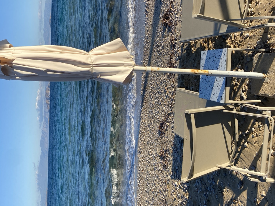 The image displays a deserted pebbled beach scene in Skala, Greece, under a clear blue sky. In the foreground, a light-colored pebbled shoreline stretches across the width of the frame, interspersed with dark organic debris. Gentle waves with white foam crest break at the water's edge. Centrally positioned on the beach is a closed, cream-colored beach umbrella, its fabric tightly secured by a cord. The umbrella's white metal pole, showing rust and wear near its base, is anchored in a concrete block. Two empty sun loungers, light taupe in color with metal frames, are arranged on the pebbles. The lounger on the left has its backrest elevated, while the one on the right is partially visible. A small square table, featuring a white speckled (terrazzo-like) surface, is situated between the two loungers, directly beneath the umbrella. Beyond the immediate shoreline, the blue-green waters of the sea extend to the horizon. In the distant background, several landmasses, appearing as islands or mountainous coastlines, are visible beneath the clear sky, with faint cloud formations hovering above some peaks. Strong sunlight illuminates the scene, creating defined shadows from the umbrella and loungers. No individuals are present, and no actions or interactions are depicted.