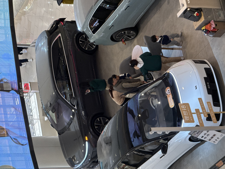 The image, captured from an elevated viewpoint, depicts an indoor commercial car display area within Daxing District, China, characterized by polished light-colored flooring and bright artificial lighting. Three new vehicles are on display. In the foreground left, a white Li Auto i8 (理想i8) extended-range hybrid SUV with a black roof and a full-width front light strip is positioned with its driver's door open. A white display board in front identifies the model and lists features in Chinese, and a small orange sticker on its windshield states "experience ultimate peace of mind in Beijing." Behind this, a dark gray SUV is parked. To the right, the rear section of a light blue compact SUV is visible, featuring a yellow security device inserted into its rear wheel. Seven individuals are present. A woman in a green jacket stands with her back partially to the camera near the dark gray SUV, looking at a mobile phone. Near the white Li Auto, a group of four interacts: a woman in a beige top leans into the open driver's door; a man in a dark vest stands beside her, looking towards the car, next to a child in a light blue top. Another woman in a dark green hoodie stands by a small circular table and two grey upholstered chairs, also observing the vehicle. A second child in a dark blue sweater walks independently to the right of the table. Two additional individuals are partially visible walking on an elevated platform in the distant background. Above the display area, a large digital screen displays blue and white graphics, including the text "IMGS." Below this screen, multiple glass display cases, consistent with a retail environment, are visible. A black backpack with a red charm and other items are contained within a wooden crate in the lower right corner of the frame.