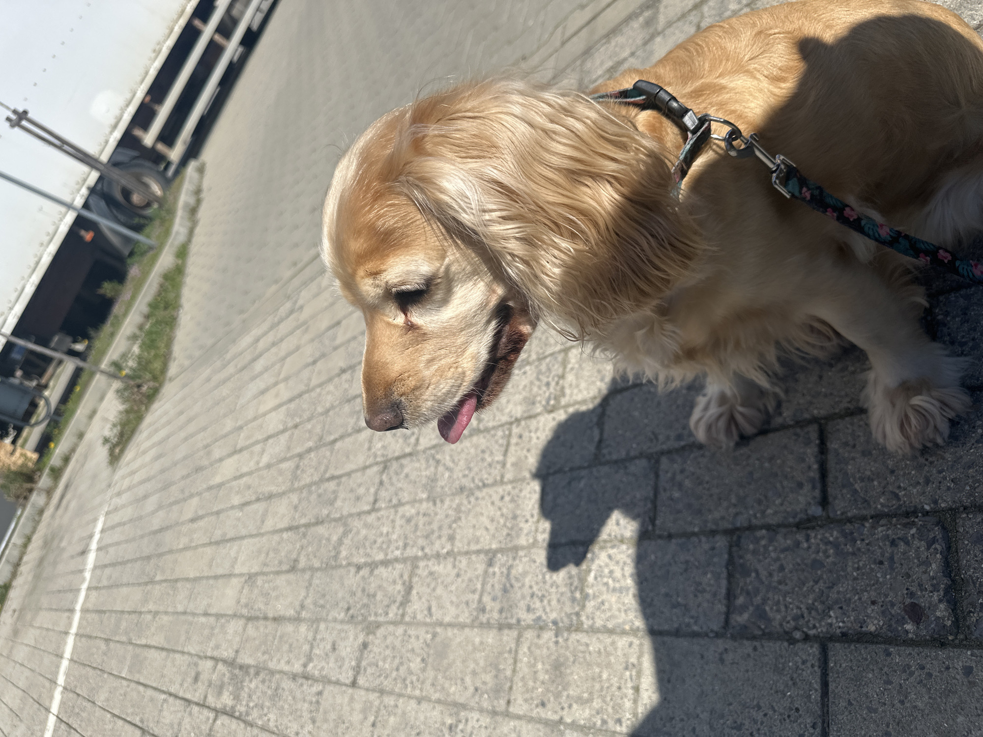A light-brown Cocker Spaniel with a floral-patterned leash stands on a paved surface with a trailer in the background. The dog's head is lowered, and its tongue is visible. The pavement is made of rectangular gray blocks with linear patterns. A shadow of the dog is cast on the pavement. The photograph was taken outdoors in daylight. No specific information allows for determining if this photo was taken in Sofia, Bulgaria.