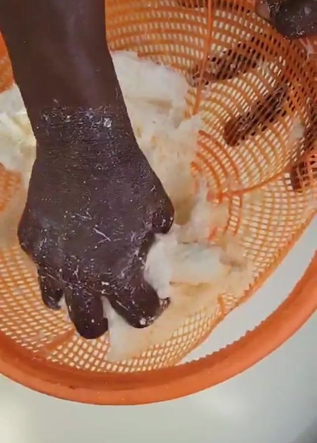 - "A person's hand is shown pushing white shredded material through an orange plastic strainer" by FM-m6iwH3, licensed under CC BY 4.0