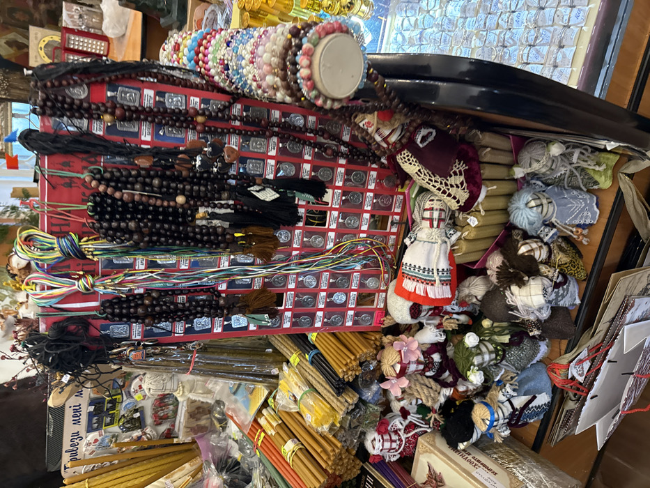 - "This image depicts an indoor retail display of religious and traditional Ukrainian goods, likely located within a church shop or souvenir store at the Kyiv Pechersk Lavra complex in Kyiv, Ukraine" by FM-HJIgS2, licensed under CC BY 4.0