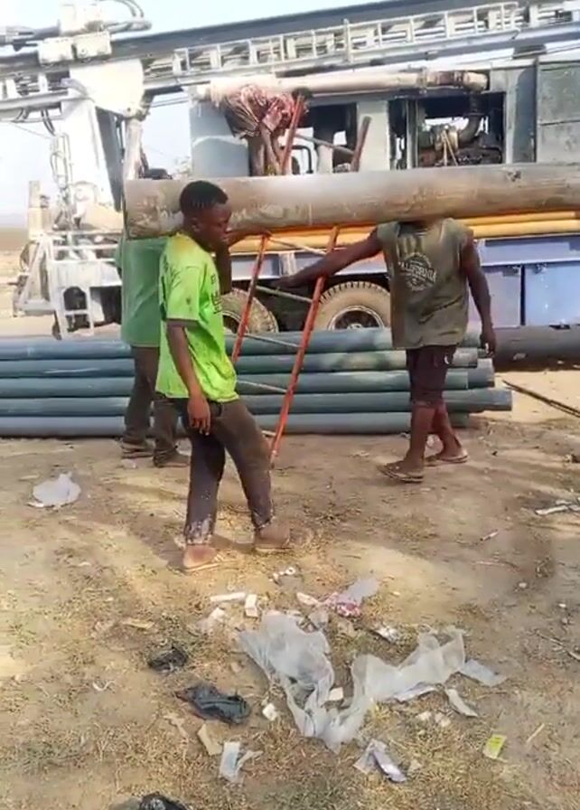 Three men are carrying a long, cylindrical, tan-colored pipe on their shoulders. They appear to be moving it away from a large piece of machinery, possibly a drilling rig. One man is on top of the drilling rig. The men are on a patch of ground with a few pipes on it and a good deal of litter. Two of the men are wearing green shirts. One is wearing a basketball jersey and shorts. One is wearing a baseball cap. The man in the jersey is at the right edge of the frame. The man on top of the rig is wearing a red patterned shirt and dark pants.