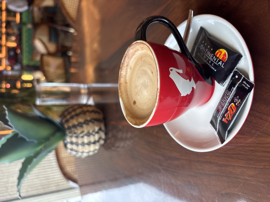 - "A red coffee cup containing a light brown foamy beverage, likely coffee, sits centered on a white saucer on a polished dark brown wooden table" by FM-CAOHw1, licensed under CC BY 4.0