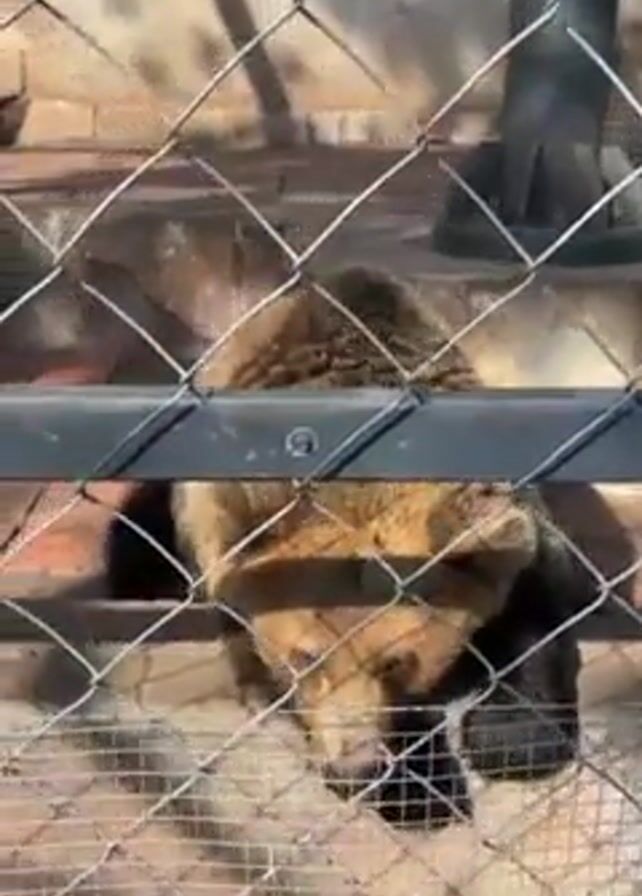 brown bear lying down in an enclosure. The bear is behind a wire fence. The enclosure is made of concrete and brick, with some dirt and vegetation. The sun is shining. The camera is moving slightly.