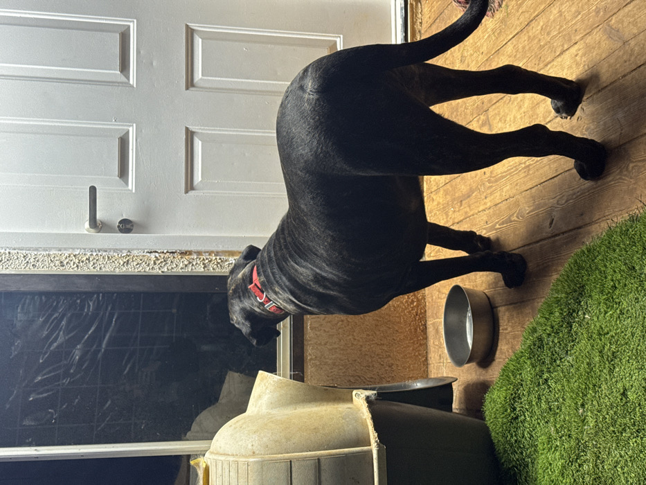 - "A brindle dog wearing a red collar stands on a wooden floor next to a patch of artificial turf" by FM-5V1Jf1, licensed under CC BY 4.0