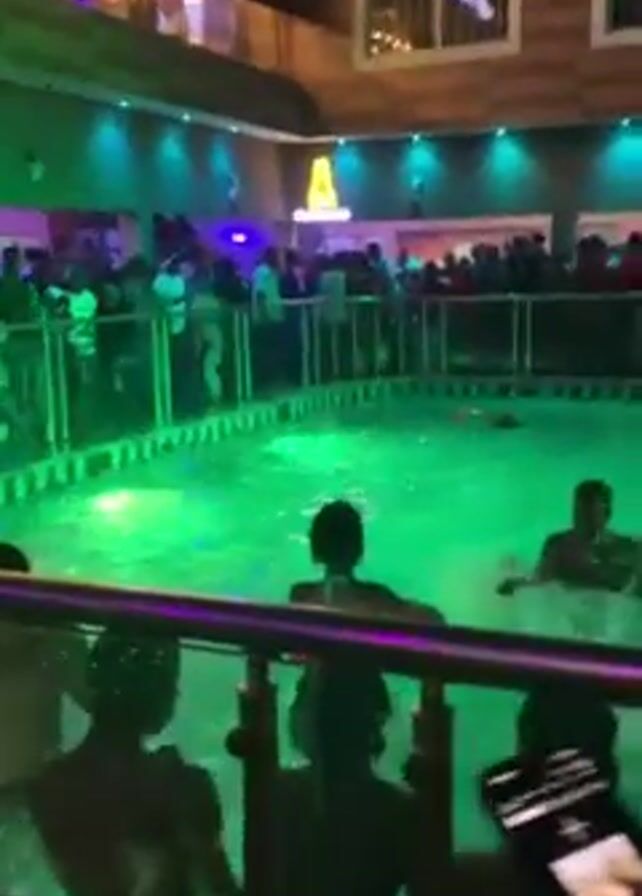 n outdoor pool party at night. Several people are in the pool, swimming and wading in the water, which is lit with green and blue lights. The pool is surrounded by a railing, and a crowd of people is visible behind it, standing on a balcony or deck. A DJ booth is also visible. In the foreground, a person is holding a phone and appears to be controlling the music. The environment suggests a lively and festive atmosphere, with people enjoying themselves in and around the pool.