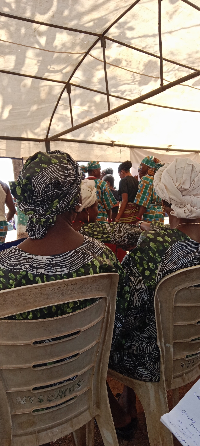 The scene depicts an outdoor gathering occurring under a white fabric canopy supported by a metal framework, in the city of Iyara, Nigeria