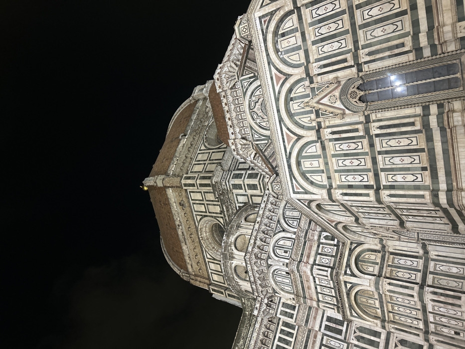 The image captures a night view of Florence's Duomo, showcasing its architectural details