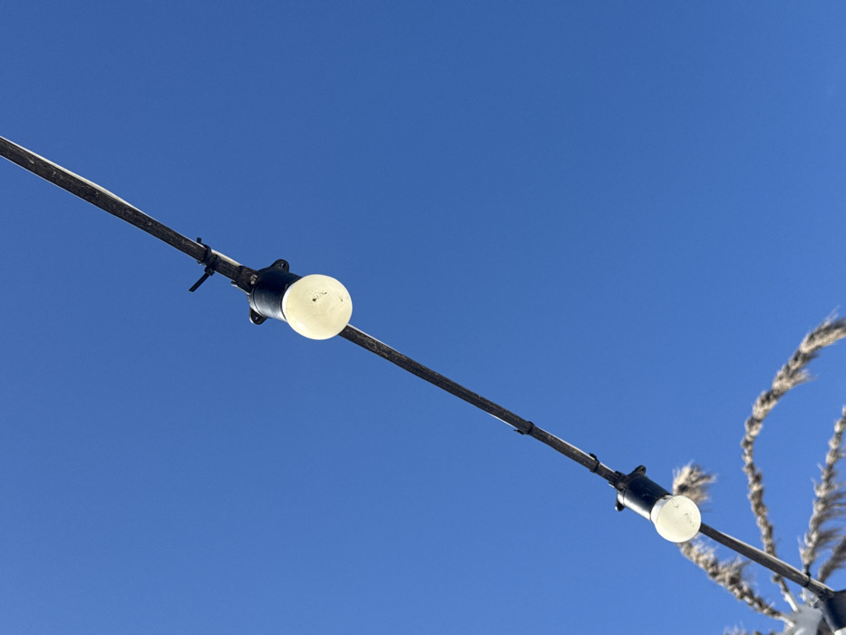 The image displays a segment of an outdoor string light installation, located in Votkinsk, Russia, under a clear, deep blue daytime sky. Two spherical light bulbs, appearing frosted white and slightly soiled, are visible with their black bases attached to a dark electrical cable. The cable traverses the frame diagonally from the upper left to the lower right. Black securing clips are discernible along the cable. In the lower-left quadrant, the tips of dried, light-colored plant material, possibly ornamental grass, are partially visible, exhibiting sparse white deposits consistent with snow. The lights are not illuminated.