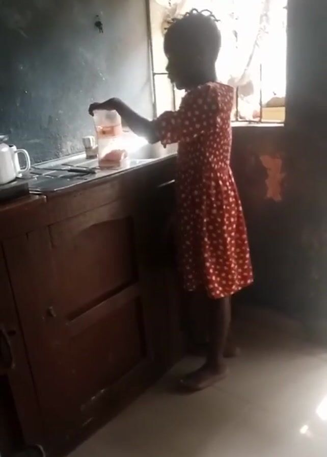 - "A young child wearing a red and white polka dot dress stands in a kitchen, facing a countertop" by FM-7Np923, licensed under CC BY 4.0