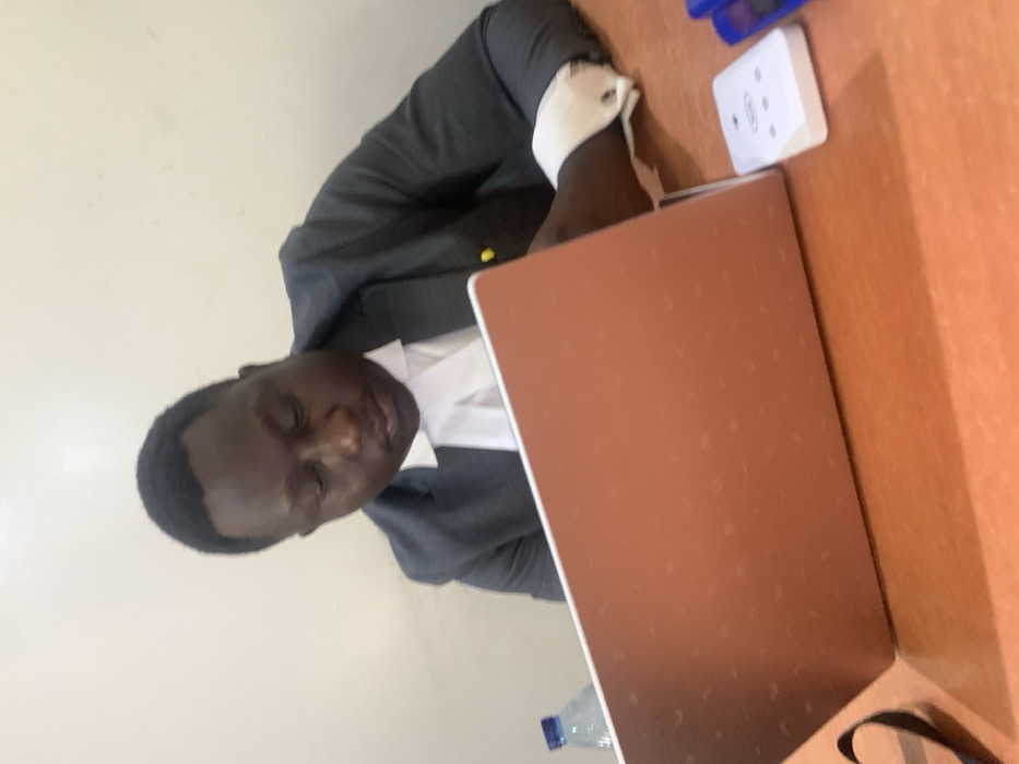 An indoor scene in Gombe, Nigeria, depicts a dark-complexioned adult male seated at an orange-brown wooden table