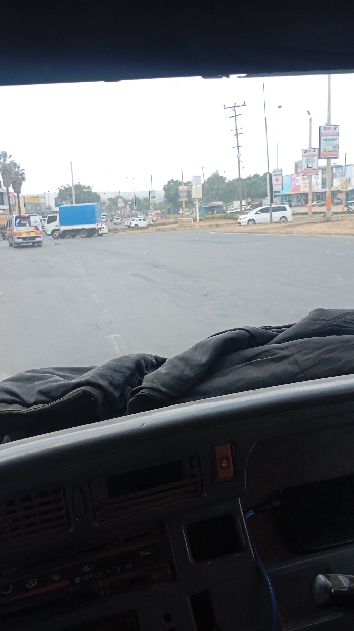 The view from a vehicle dashboard shows a sprawling intersection. Various vehicles like a police car, a truck with a blue tarpaulin, and a white van are visible. Utility poles and numerous billboards line the roadside, suggesting a commercial or urban area. The sky is overcast, casting a muted light over the scene. A dark, possibly folded fabric rests on the dashboard.