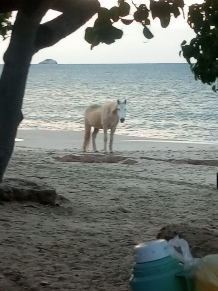 A white horse stands on a sandy beach near the water's edge. In the background, the sea stretches to the horizon with a small island visible in the distance. A tree with dense foliage is prominent in the foreground, partially framing the scene. A water cooler and trash are in the extreme bottom of the photo.