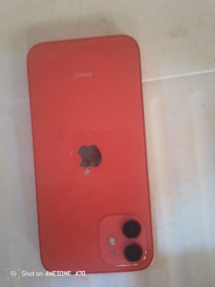A red Apple iPhone, consistent with an iPhone 11 or 12 model due to its dual rear camera array and form factor, is depicted resting face down on a light-colored, possibly tiled surface. The phone's back casing is visible, displaying the distinct Apple logo, the dual camera lenses, and a flash unit. Faint "(product)red" text is discernable near the top edge of the device's rear panel. The phone exhibits minor surface scratches and some dust accumulation. The Apple logo shows slight discoloration or residue within its cutout. The underlying surface displays subtle linear patterns, indicating joint lines or panel divisions. The image itself bears a watermark in the lower-left corner stating, "Shot on AWESOME A70." No individuals are present, and no actions or interactions are occurring beyond the static placement of the phone. This scene is located in the city of Onitsha, Nigeria.