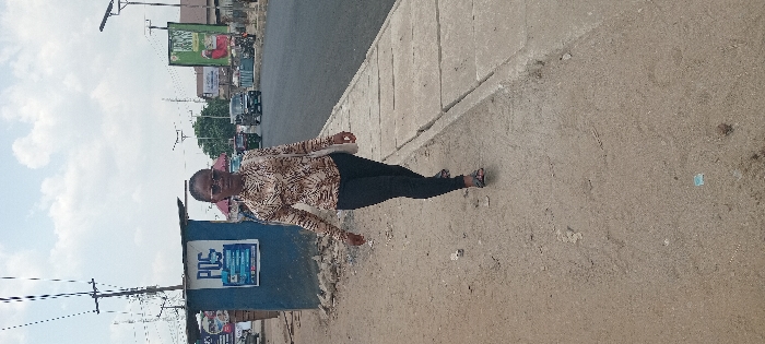 The image presents an urban street scene in Aba, Abia, Nigeria, under a partially cloudy sky