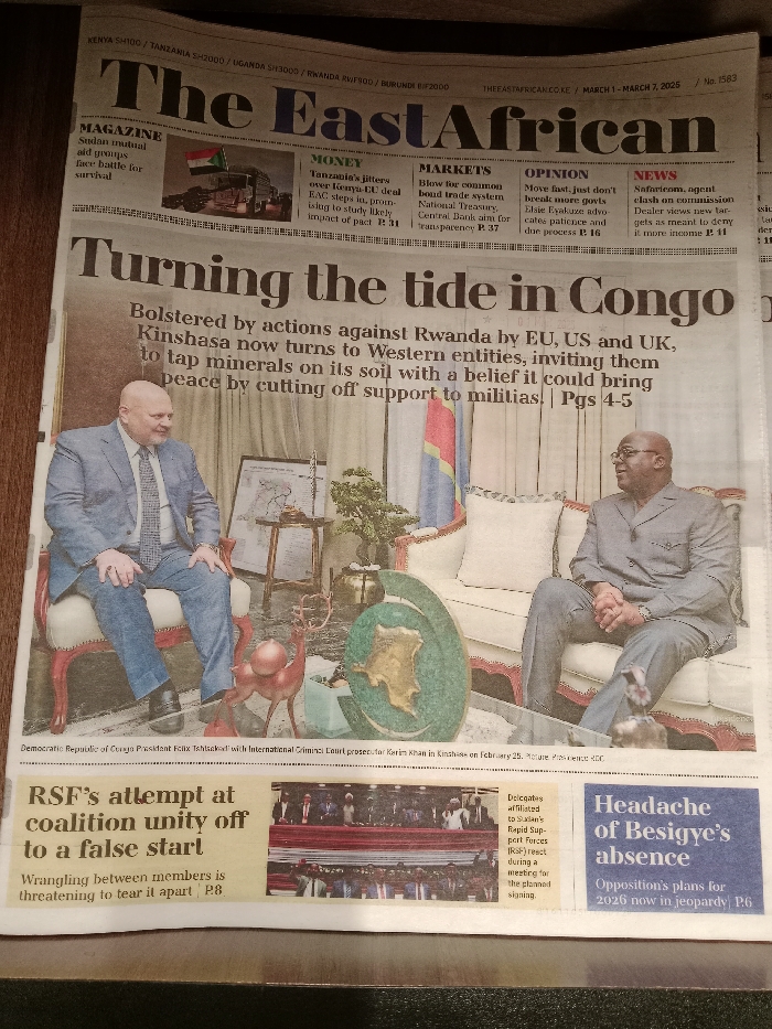 newspaper article titled "Turning the tide in Congo" published in "The EastAfrican" on March 1-7, 2023, and a photo of the Democratic Republic of Congo President Felix Tshisekedi with International Criminal Court prosecutor Karim Khan in Kinshasa on February 25
