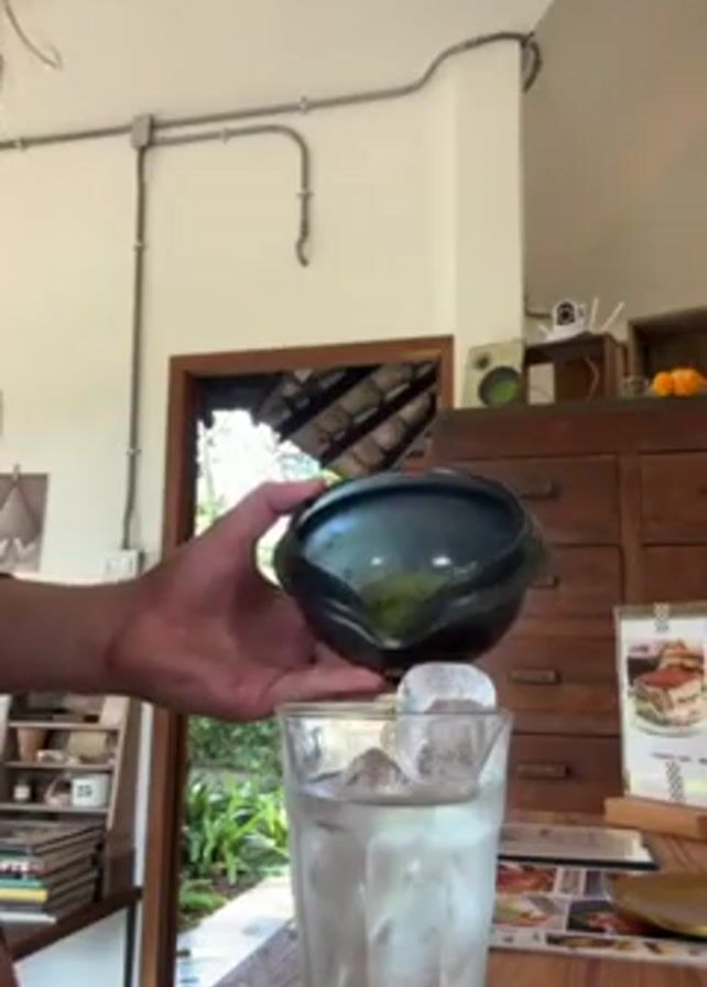 person preparing a beverage. Someone pours a dark green liquid from a black bowl into a clear glass filled with ice. The person is standing at a wooden counter. Behind them are shelves with various objects. In the background, there is a garden visible through a doorway. The video appears to be shot indoors in a cafe or restaurant.