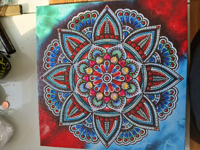 - "The image displays a completed square diamond painting on canvas, laid flat on a white surface in Langen, Germany" by FM-0UC0T2, licensed under CC BY 4.0