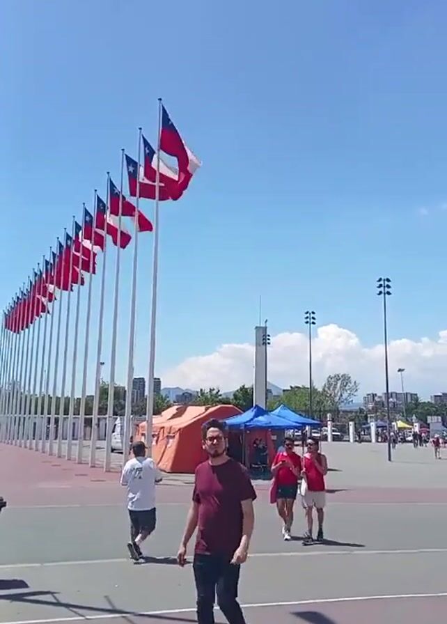 n outdoor area on a sunny day with a row of Chilean flags waving in the breeze. Several people are walking around, some wearing red shirts. In the background, there's a large building, a tall tower, and two tents. The area appears to be a plaza or open space. The camera follows people passing by.