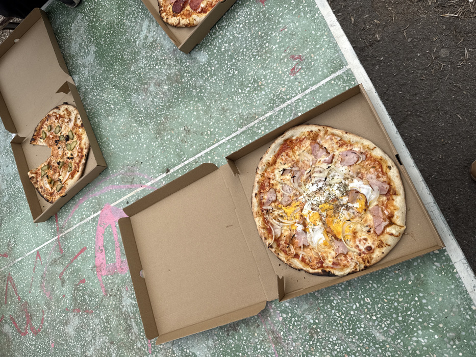- "Three open brown cardboard pizza boxes rest on a worn, speckled green concrete surface, consistent with an outdoor public recreational area or schoolyard in Sofia, Bulgaria" by FM-lbquw2, licensed under CC BY 4.0