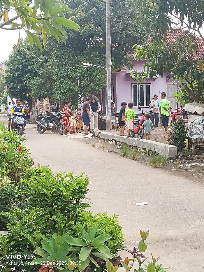 A residential street scene depicts a group of people gathered on the side of the road. Several children stand on a concrete barrier. Adults stand nearby, engaged in conversation. Motorcycles are parked along the roadside. A person on a motorcycle is driving on the road. The buildings are a mix of styles with a house painted lavender visible in the background. Lush green trees and bushes line the road and the houses, partially obscuring the buildings and people.