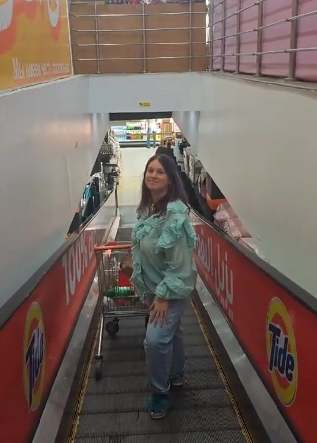A woman is riding on a moving walkway in a grocery store, facing the camera and waving. She is pushing a small shopping cart containing some items. She is wearing a light blue ruffled blouse and jeans. The walkway has red sides with Tide advertisements in both English and Arabic. Behind her, the walkway leads to another level of the store with various products on shelves. The store has bright overhead lighting. There is a sign in Russian visible in the background.